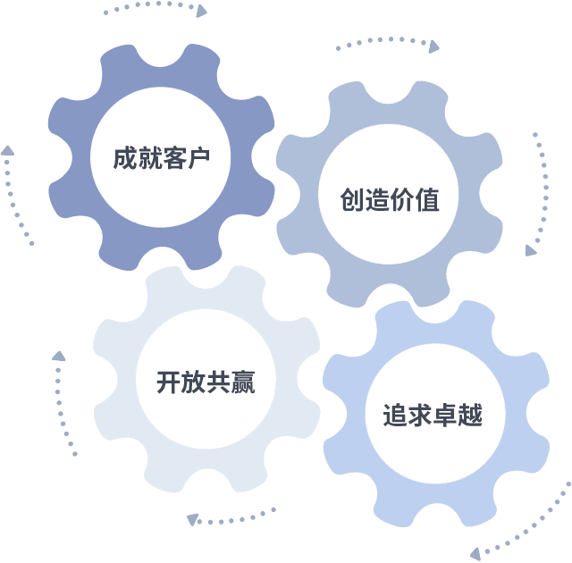 成就客户是一切决策的出发点,,创造价值是衡量所有工作的标准,,追求卓越是我们做事做人的态度,,,开放共赢是我们的格局也是最终的结果。。。价值观的齿轮环环相扣,,,,推动着组织里的每个人不断向前。。。